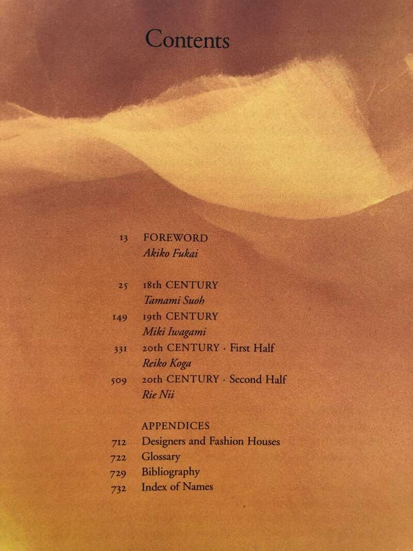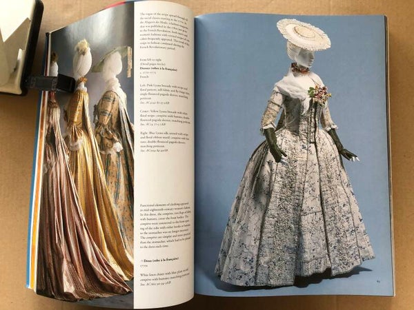 A beautifully-produced book. Traces the history of fashion over 3 centuries, including all sorts of stunning fabrics and designs. With accessories such as fans, stomachers, corsets, shoes and more and with each item enticingly described, although the focus is on textile fashions. With three appendices: Designers and Fashion Houses, Glossary, and an Index of Names. A visual feast!