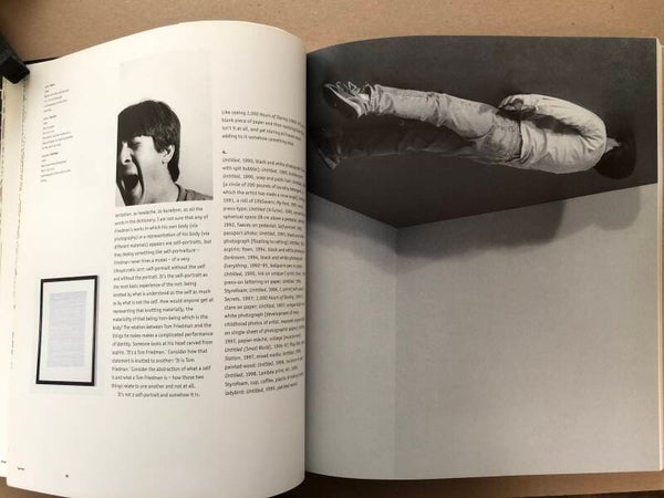 In zijn Survey onderzoekt de Amerikaanse kunstcriticus Bruce Hainley de belangrijkste werken van de kunstenaar tot nu toe, met als centraal thema Friedmans werk als zelfportret. De in Los Angeles wonende schrijver Dennis Cooper bespreekt met de kunstenaar zijn werkprocessen en zijn niet-kunstzinnige invloeden, zoals hedendaagse elektronische muziek. De Britse kunstenaar en schrijver Adrian Searle richt zich op het werk Untitled (1993), een perfecte cirkel van plastic drinkbekers, en onderzoekt de ongewone transformatie van het bekende tot een object van onverwachte schoonheid. De kunstenaar heeft gekozen voor het korte verhaal The Dinner Party (1919) van de Zwitserse schrijver Robert Walser, dat de interesse van de kunstenaar in de magie van alledaagse gebeurtenissen weerspiegelt, en voor de verklarende woordenlijst van een psychologisch boek, Info-Psychology (1975-76), van Timothy Leary, die de lijstachtige schrijfstijl van de kunstenaar weerspiegelt. De teksten van Tom Friedman variëren van een interview met Hudson, directeur van de New Yorkse galerie Feature Inc., tot fragmenten uit de notitieboekjes en tekstwerken van de kunstenaar.