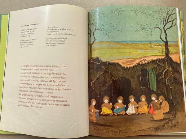 Prentenboek met het verhaal van de wortelkindertjes. Met groot afgebeelde prenten in goede staat, de verhaaltekst en de muziekteksten en notenbalken, zie foto's
