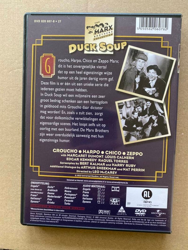 - Duck Soup Duck Soup is een scherpe politieke satire en tevens de grappigste en waanzinnigste Marx Brothers film. Deze film bevat heel wat zeer bekende scènes waaronder ook de ultieme strijdscène die later zo vaak is gekopieerd door de grote namen, van Woody Allen tot Mad Magazine. speelduur: 1 uur 5 min.