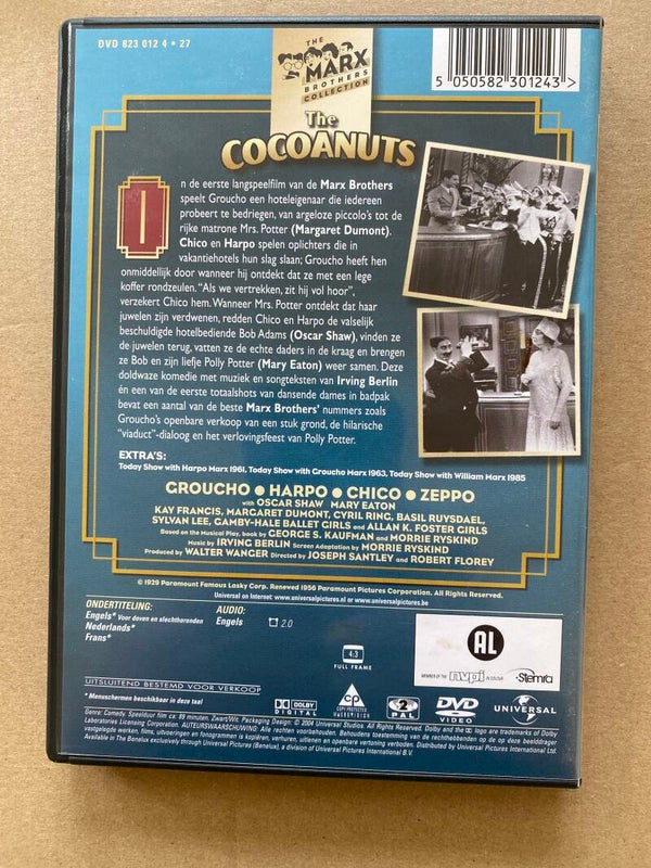 - The Cocoanuts 'The Cocoanuts' was de eerste sprekende film van de Marx Brothers die, toen hij in 1929 uitkwam, onmiddellijk een klassieker werd. De vier broers proberen tegelijkertijd een hotel in Florida uit te baten én een juwelenkraak te verijdelen! Dankzij 'The Cocoanuts', die ook een aantal muzikale nummers bevat, groeiden de broers uit tot de populairste komische act van hun tijd. speelduur: 1 uur 33 min.
