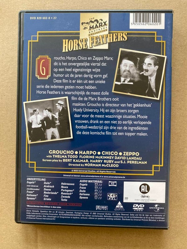 - Horse Feathers Dé Marx Brothers komedie pur sang. Groucho, Harpo, Chico en ja, ook Zeppo, laten zich van hun dolste kant zien in deze lachwekkende en anarchistische parodie op het studentenleven. Als directeur van Huxley College, een man die altijd wel in is voor een grapje, probeert Groucho de studenten in toom te houden, uiteraard met hilarische gevolgen! Horse Feathers bevat dan ook een aantal van de schitterendste scènes uit de geschiedenis van de komische film. speelduur: 1 uur 3 min.