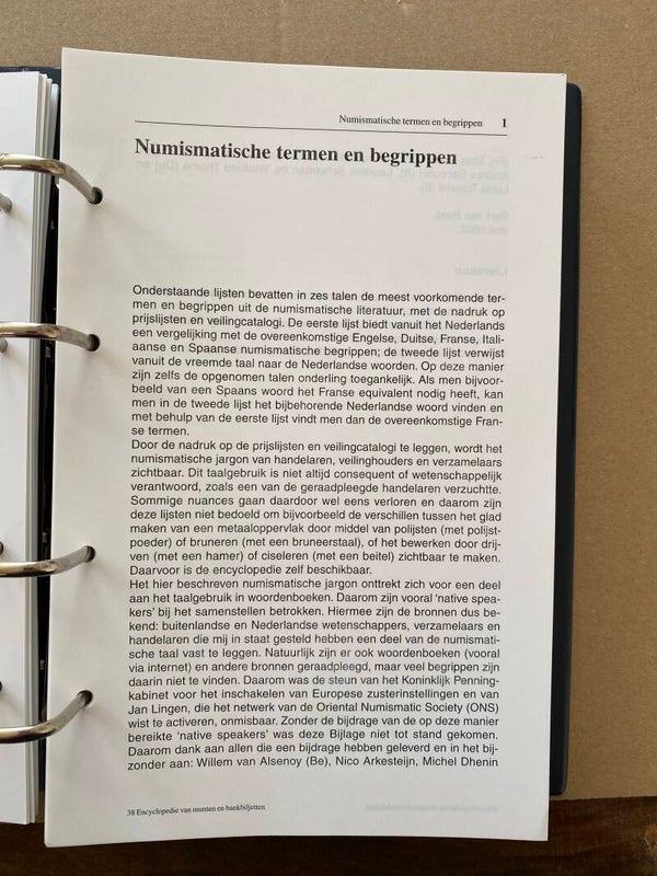 Losbladig systeem in drie geplastificeerde ringbanden met duizenden pagina's informatie en illustraties. Geheel compleet, incl. bijlagen o.a. catalogus van kloppen en CD-Rom met databank programma.Inclusief de bijlagen: 1): Catalogus van Kloppen 2): Latijnse Spreuken op Munten 3): De Noord- en Zuidnederlandse Muntmeesters 4): Lijsten van Gemeenten in België, Nederland en Luxemburg 5): Musea 6): Literatuur 7): Ontwerpers Munten en Bankbiljetten Benelux 8): Numismatische Termen en Begrippen.