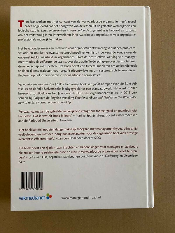 Verwaarloosde organisaties (2011), het vorige boek van Joost Kampen (Van de Bunt Adviseurs en de Vrije Universiteit), is uitgegroeid tot een standaardwerk. Het werd in 2012 bekroond tot Boek van het Jaar door de Orde van organisatieadviseurs. In 2015 verscheen bij Palgrave de Engelse vertaling Emotional Abuse and Neglect in the Workplace: how to restore normal organizational life.