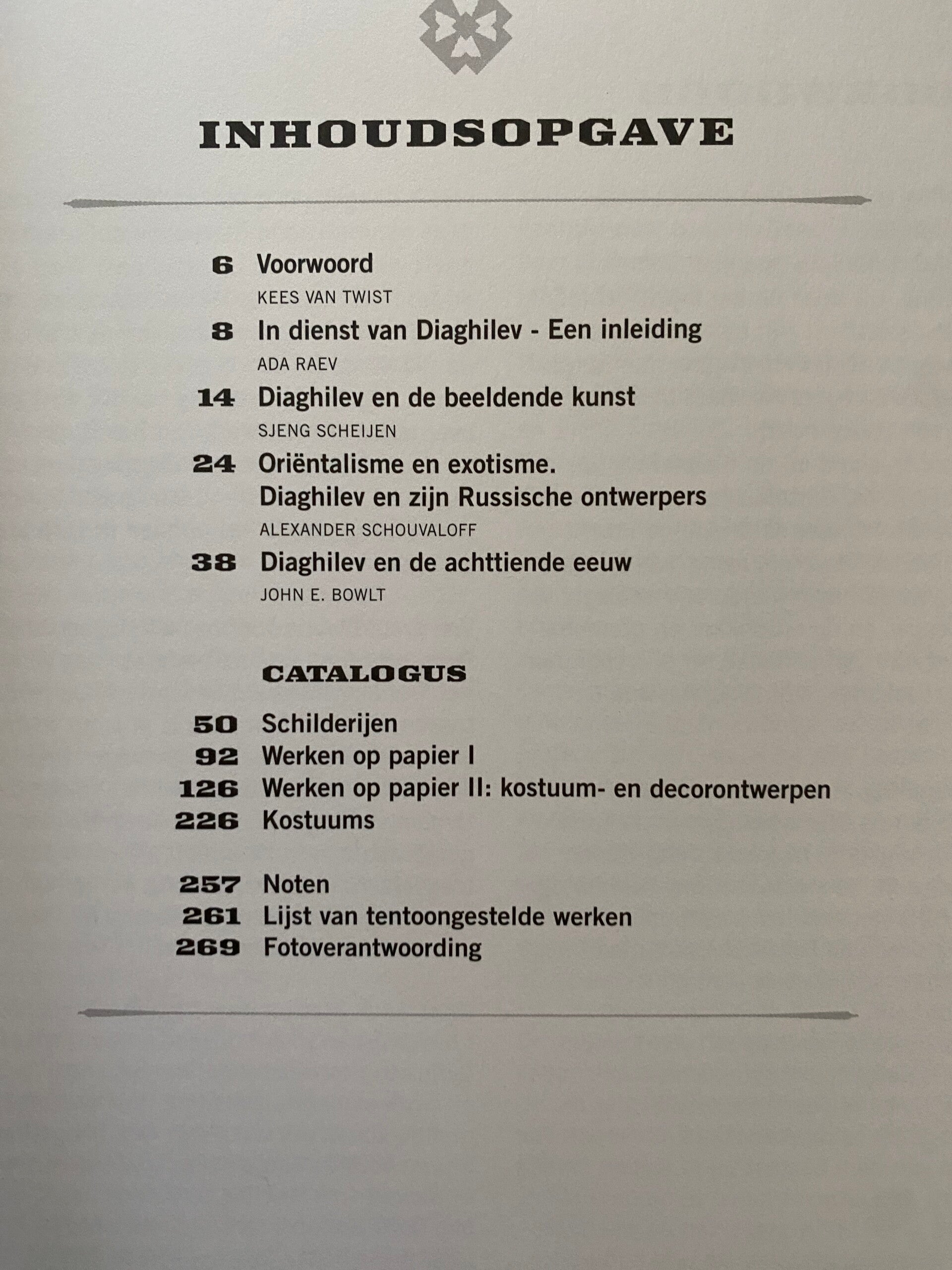 Catalogus bij de tentoonstelling waarin getoond wordt dat de vernieuwingen in de kunst in Europa die op instigatie van balletleider, impressario en mecenas Diaghilev (1872-1929) plaatsvonden, hun oorsprong hadden in het Russische fin de siècle.