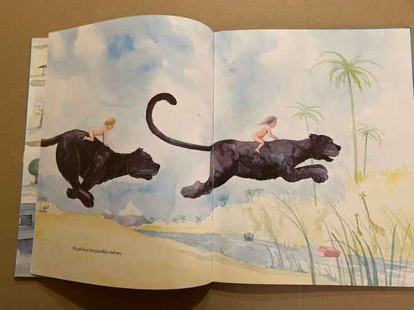 Zo begint deze bijzondere versie van het scheppingsverhaal, door Helme Heine opgetekend in prachtige aquarellen.